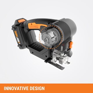 This 20V Axis Reciprocating/Jig Saw 2-in-1 gives you a whole lot of tool(s) for the money. There's no need to buy a separate reciprocating saw and jigsaw when you have an Axis. Worx engineers figured out that those two saws actually employ a similar motion to get their different jobs done, and designed a way to put that functionality into one tool. So you get the raw power of a reciprocating saw (3000/min of no-load speed) to tear down structures, but then the head folds down into the base to give you more balance to make those intricate cutouts that only a jigsaw can perform. Plus, there's no cord to get in your way, so you're free to move. And at only 4.2 lbs, you can work long hours without getting hand and arm fatigue. The jigsaw is made to cut through wood (2" cutting capacity), PVC pipe (2"), and steel plate (5/32"). While the reciprocating saw also cuts wood and PVC pipe at 2", but steel pipe at 2", too. And they both have a ?" stroke length. With a built-in dust blower, you'll always see the shapes you're cutting in jigsaw mode. And the safety lock-off switch prevents accidental starting. Get an innovative 20V Axis Reciprocating/Jig Saw 2-in-1 from Worx and get more done, with less strain on both your hands and your wallet.