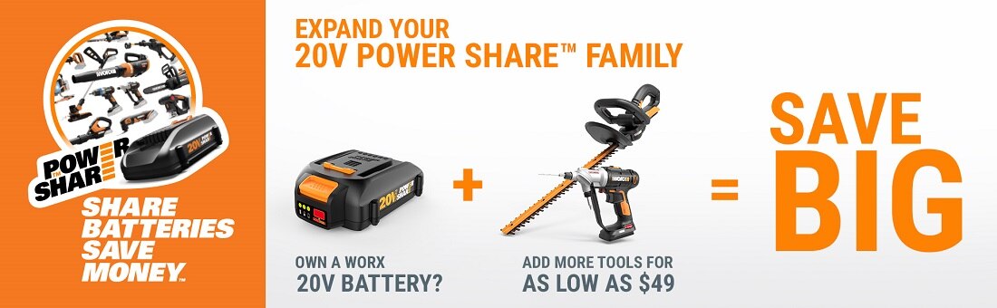 [SHARE BATTERIES, SAVE MONEY] Worx Power Share is compatible with all Worx 20v and 40v tools, outdoor power and lifestyle products